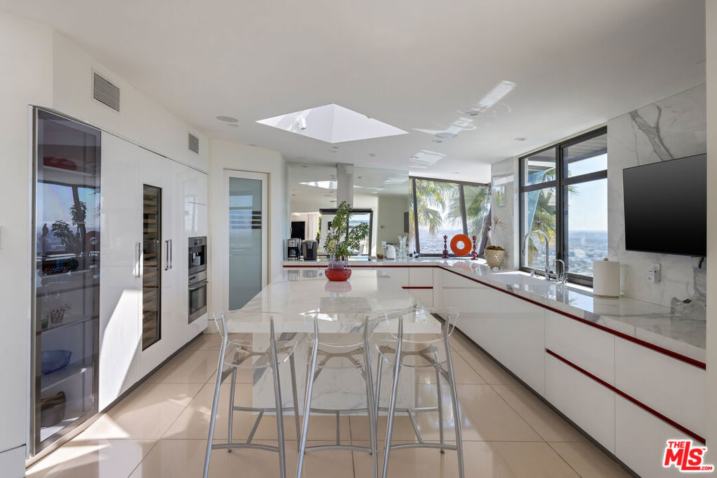 Perched on a rare promontory within a coveted celebrity enclave in The Bird Streets, this extraordinary estate commands a breathtaking panorama, where the city skyline unfolds seamlessly into the Pacific. A cinematic setting once featured in HBO's Entourage, set behind a private gated entry with serene water features, the home is an architectural statement of height and light, seamlessly blending its elevated design with a commanding vantage point over the city.An elegant glass pivot door reveals a soaring double-height foyer, where a glass-bottom floor and floating staircase establish a striking interplay of transparency and light. The formal dining room captivates with floor-to-ceiling awning windows that perfectly frame the skyline, while the expansive living room unfolds onto a sweeping terrace above the clouds, designed for both grand-scale dining and relaxed lounging. A more intimate piano lounge, centered around a fireplace and sleek bar, creates an inviting setting for evening gatherings, while a nearby TV nook offers a cozy retreat, balancing the openness of the main living spaces with a sense of warmth and intimacy. The chef's kitchen, equipped with Miele appliances, large marble island, and espresso bar, captures mesmerizing south-facing views stretching from West Hollywood to Long Beach. A full butler's pantry enhances both function and storage, discreetly serving the culinary space.Ascending to the second floor, the primary suite unfolds as a private sanctuary, complete with an executive office (with full bath and walk-in closet), along with a bedroom fireplace and sliding walls of glass that open onto an extended private terrace with a fitness area. The ensuite is a spa-like retreat, boasting an oversized steam shower with a soaking tub set within, dual vanities, a bidet, and a boutique-style walk-in closet. A secondary primary suite mirrors this level of luxury, featuring a Juliette balcony, dual-sink ensuite with a soaking tub and steam shower, and a generous walk-in closet. The lower level seamlessly integrates entertainment and leisure, with a private guest suite opening onto an outdoor patio with city views. A sleek bar and lounge lead to a sunken theater that transforms into an indoor-outdoor space, perfect for game day gatherings.Outside, the estate's grounds offer a breathtaking extension of the living space. A Viking-equipped outdoor kitchen, complete with a built-in fireplace, sits beneath a covered patio with heating, where an elongated marble dining table accommodates twenty guests. The infinity-edge pool and elevated spa trace the curvature of the property, punctuated by an intricate art installation that plays against the skyline. A mirrored bar reflects the twinkling city lights, complementing an array of luxe amenitiesincluding a craft beer dispenser, sauna, outdoor shower, and full bath. The sunken fire pit lounge, designed to give the sensation of floating above the city, is a showstopping finale to an already incomparable setting.Additional highlights include a three-car garage with private street parking and a unique land extension that reaches Wetherly Drive, offering the potential to establish a more direct access route to Sunset Boulevard. A true rarity in the Bird Streets, this estate is a fully immersive experience in panoramic luxury, where every vantage point is a masterpiece.